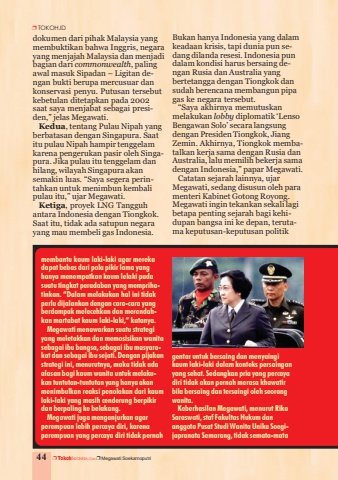 44 S TokohINDONESIA.COM S Megawati SoekarnoputriSTOKOH.IDdokumen dari pihak Malaysia yangmembuktikan bahwa Inggris, negarayang menjajah Malaysia dan menjadibagian dari commonwealth, palingawal masuk Sipadan – Ligitan dengan bukti berupa mercusuar dankonservasi penyu. Putusan tersebutkebetulan ditetapkan pada 2002saat saya menjabat sebagai presiden,” jelas Megawati.Kedua, tentang Pulau Nipah yangberbatasan dengan Singapura. Saatitu pulau Nipah hampir tenggelamkarena pengerukan pasir oleh Singapura. Jika pulau itu tenggelam danhilang, wilayah Singapura akansemakin luas. “Saya segera perintahkan untuk menimbun kembalipulau itu,” ujar Megawati.Ketiga, proyek LNG Tangguhantara Indonesia dengan Tiongkok.Saat itu, tidak ada satupun negarayang mau membeli gas Indonesia.Bukan hanya Indonesia yang dalamkeadaan krisis, tapi dunia pun sedang dilanda resesi. Indonesia pundalam kondisi harus bersaing dengan Rusia dan Australia yangbertetangga dengan Tiongkok dansudah berencana membangun pipagas ke negara tersebut.“Saya akhirnya memutuskanmelakukan lobby diplomatik ‘LensoBengawan Solo’ secara langsungdengan Presiden Tiongkok, JiangZemin. Akhirnya, Tiongkok membatalkan kerja sama dengan Rusia danAustralia, lalu memilih bekerja samadengan Indonesia,” papar Megawati.Catatan sejarah lainnya, ujarMegawati, sedang disusun oleh paramenteri Kabinet Gotong Royong.Megawati ingin tekankan sekali lagibetapa penting sejarah bagi kehidupan bangsa ini ke depan, terutama keputusan-keputusan politikmembantu kaum laki-laki agar merekadapat bebas dari pola pikir lama yanghanya menempatkan kaum lelaki padasuatu tingkat peradaban yang memprihatinkan. “Dalam melakukan hal ini tidakperlu dijalankan dengan cara-cara yangberdampak melecehkan dan merendahkan martabat kaum laki-laki,” katanya.Megawati menawarkan suatu strategiyang meletakkan dan memosisikan wanitasebagai ibu bangsa, sebagai ibu masyarakat dan sebagai ibu sejati. Dengan pijakanstrategi ini, menurutnya, maka tidak adaalasan bagi kaum wanita untuk melakukan tuntutan-tuntutan yang hanya akanmenimbulkan reaksi penolakan dari kaumlaki-laki yang masih cenderung berpikirdan berpaling ke belakang.Megawati juga menganjurkan agarperempuan lebih percaya diri, karenaperempuan yang percaya diri tidak pernahgentar untuk bersaing dan menyaingikaum laki-laki dalam konteks persainganyang sehat. Sedangkan pria yang percayadiri tidak akan pernah merasa khawatirbila bersaing dan tersaingi oleh seorangwanita.Keberhasilan Megawati, menurut RikaSaraswati, staf Fakultas Hukum dananggota Pusat Studi Wanita Unika Soegijapranata Semarang, tidak semata-mata