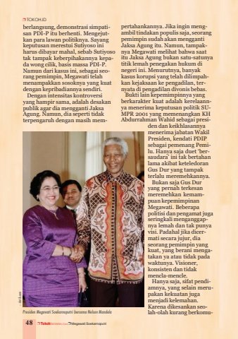 48 S TokohINDONESIA.COM S Megawati SoekarnoputriSTOKOH.IDberlangsung, demonstrasi simpatisan PDI-P itu berhenti. Mengejutkan para lawan politiknya. Sayangkeputusan merestui Sutiyoso iniharus dibayar mahal, sebab Sutiyosotak tampak keberpihakannya kepada wong cilik, basis massa PDI-P.Namun dari kasus ini, sebagai seorang pemimpin, Megawati telahmenampakkan sosoknya yang kuatdengan kepribadiannya sendiri.Dengan intensitas kontroversiyang hampir sama, adalah desakanpublik agar dia mengganti JaksaAgung. Namun, dia seperti tidakterpengaruh dengan masih mempertahankannya. Jika ingin mengambil tindakan populis saja, seorangpemimpin sudah akan menggantiJaksa Agung itu. Namun, tampaknya Megawati melihat bahwa saatitu Jaksa Agung bukan satu-satunyatitik lemah penegakan hukum dinegeri ini. Menurutnya, banyakkasus korupsi yang telah dilimpahkan kejaksaan ke pengadilan, ternyata di pengadilan divonis bebas.Bukti lain kepemimpinnya yangberkarakter kuat adalah kerelaannya menerima keputusan politik SUMPR 2001 yang memenangkan KHAbdurrahman Wahid sebagai presiden dan keikhlasannyamenerima jabatan WakilPresiden, kendati PDIPsebagai pemenang Pemilu. Hanya saja duet ‘bersaudara’ ini tak bertahanlama akibat keteledoranGus Dur yang tampakterlalu meremehkannya.Bukan saja Gus Duryang pernah terkesanmeremehkan kemampuan kepemimpinanMegawati. Beberapapolitisi dan pengamat jugaseringkali menganggapnya lemah dan tak punyavisi. Padahal jika dicermati secara jujur, diaseorang pemimpin yangkuat, yang berani mengatakan ya atau tidak padawaktunya. Visioner,konsisten dan tidakmencla-mencle.Hanya saja, sifat pendiamnya, yang selain merupakan kekuatan jugamenjadi kelemahan.Karena dikesankan seolah-olah kurang berkomu- Presiden Megawati Soekarnoputri bersama Nelson Mandela:: detik.com